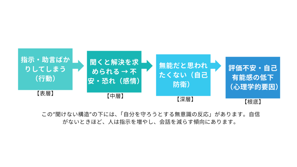 つまり、“聞くこと”が怖いのです。質問の背後にあるのは、答えられない自分への不安や、リーダーとしての自尊心の揺らぎ。これは本人も自覚していない防衛反応です。でも、それが結果として“部下の話を聞かない指導”を作ってしまう。