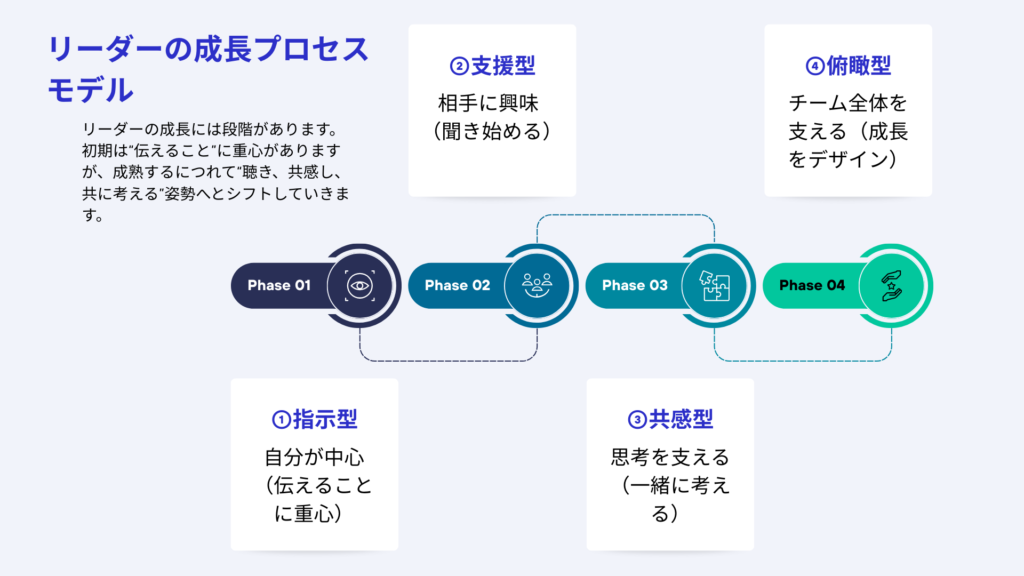 そう考えると、リーダーの仕事は「正解を与えること」ではなく、「考えるプロセスを支えること」だと言えます。重要なのは観察と対話。チームメンバーがどこで混乱し、どう判断しているかを丁寧に聞き取り、その思考構造に手を添える。これこそがファシリテーション型リーダーシップです。